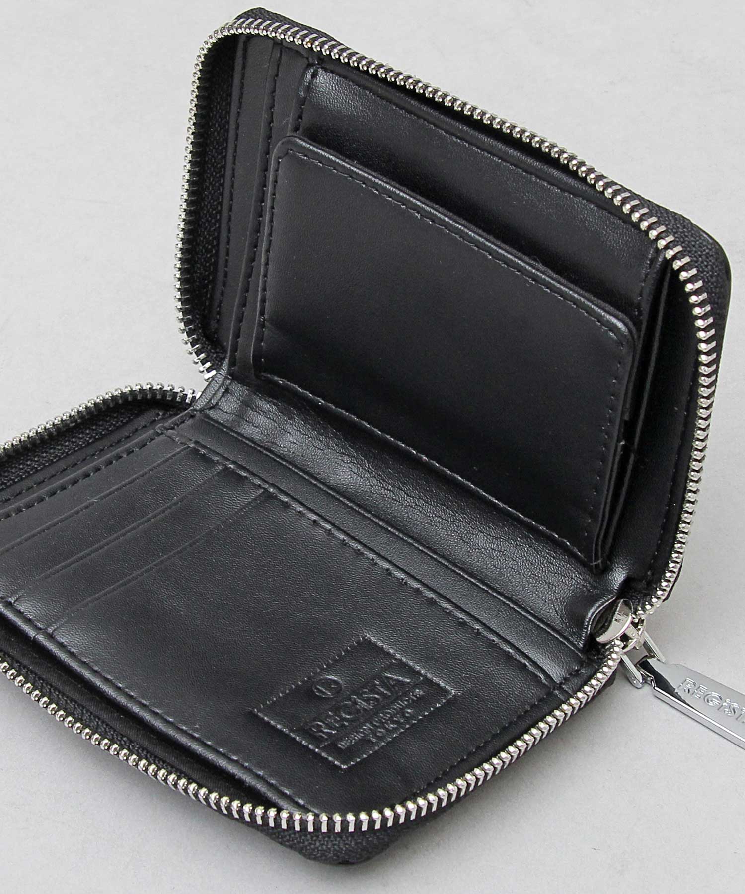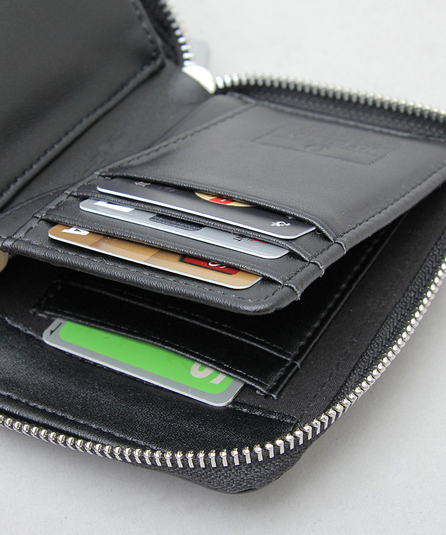 厚みのあるスプリットレザーを用いた、コンパクトなラウンドジップウォレット。