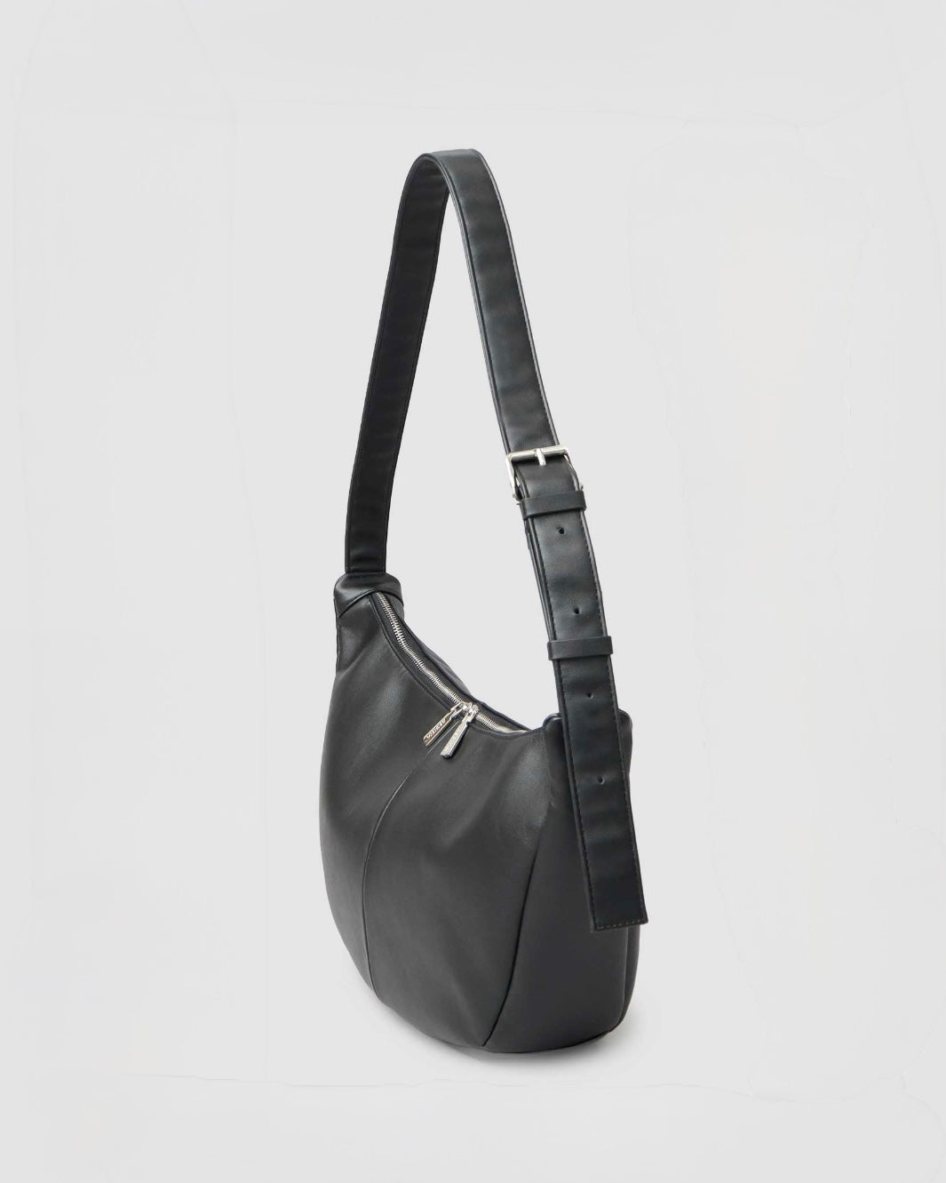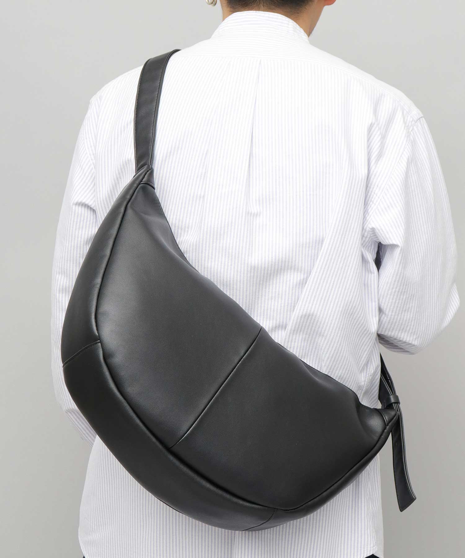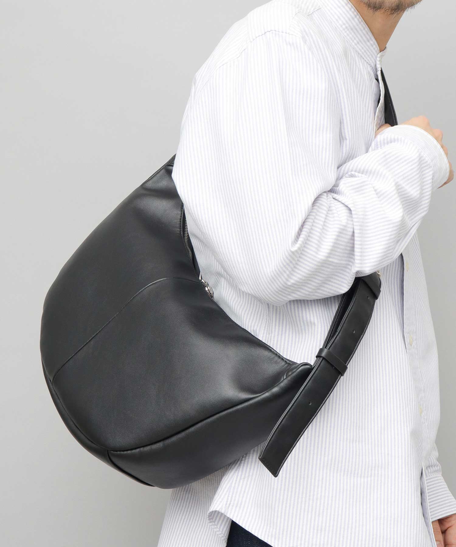 スプリットレザーの上品な質感が際立つ、バナナ型ショルダーバッグ。