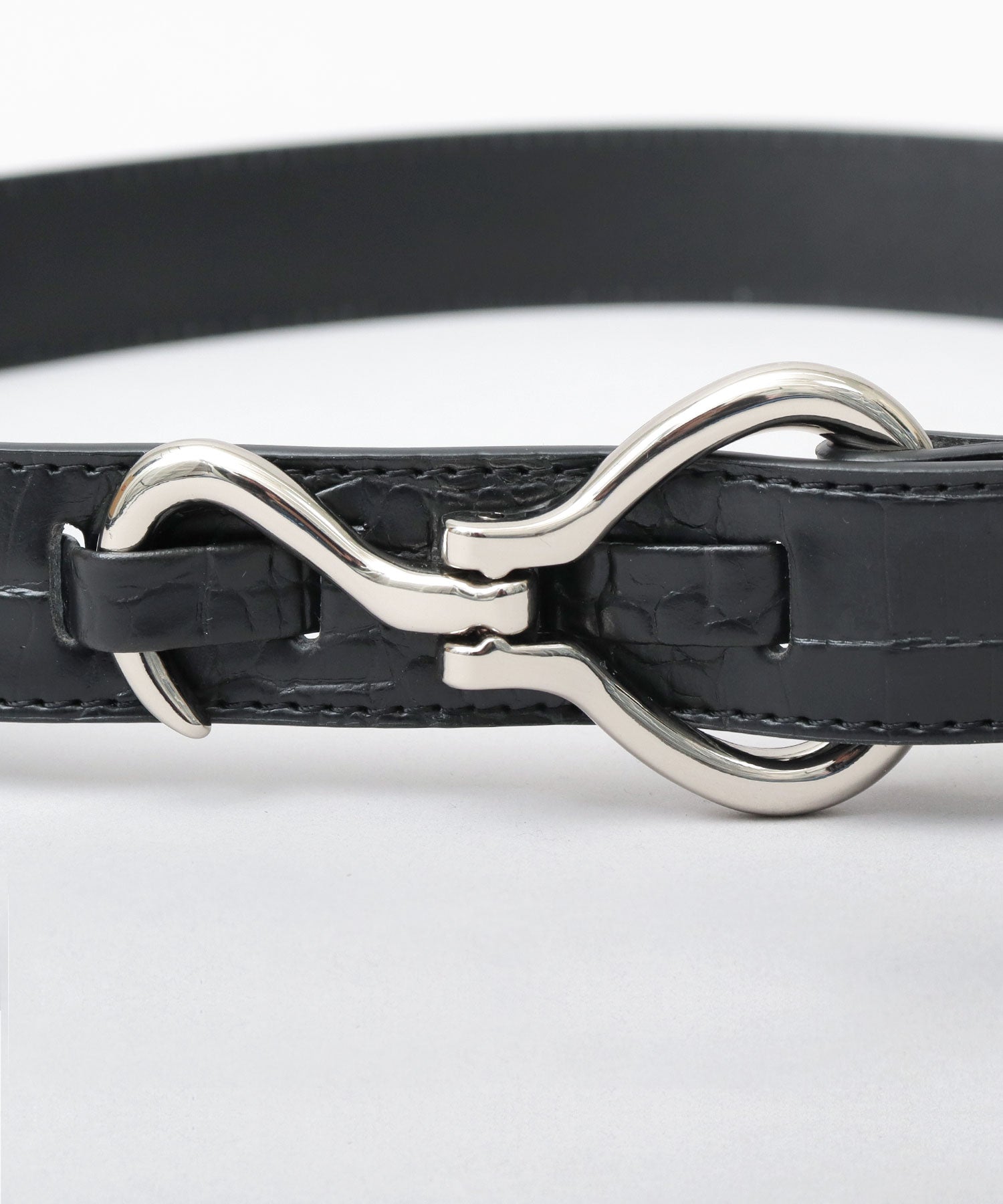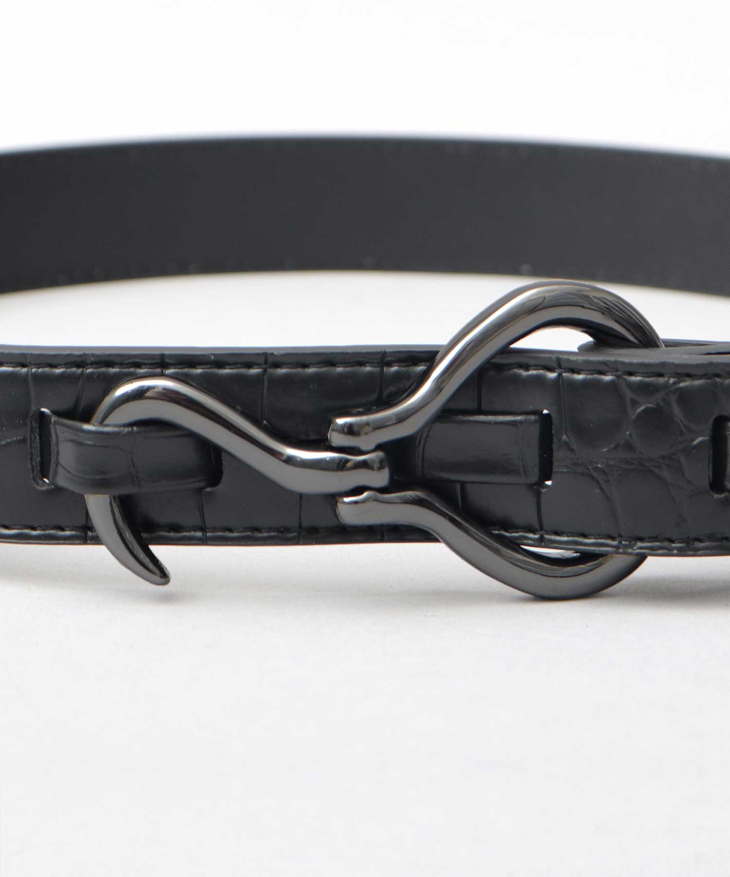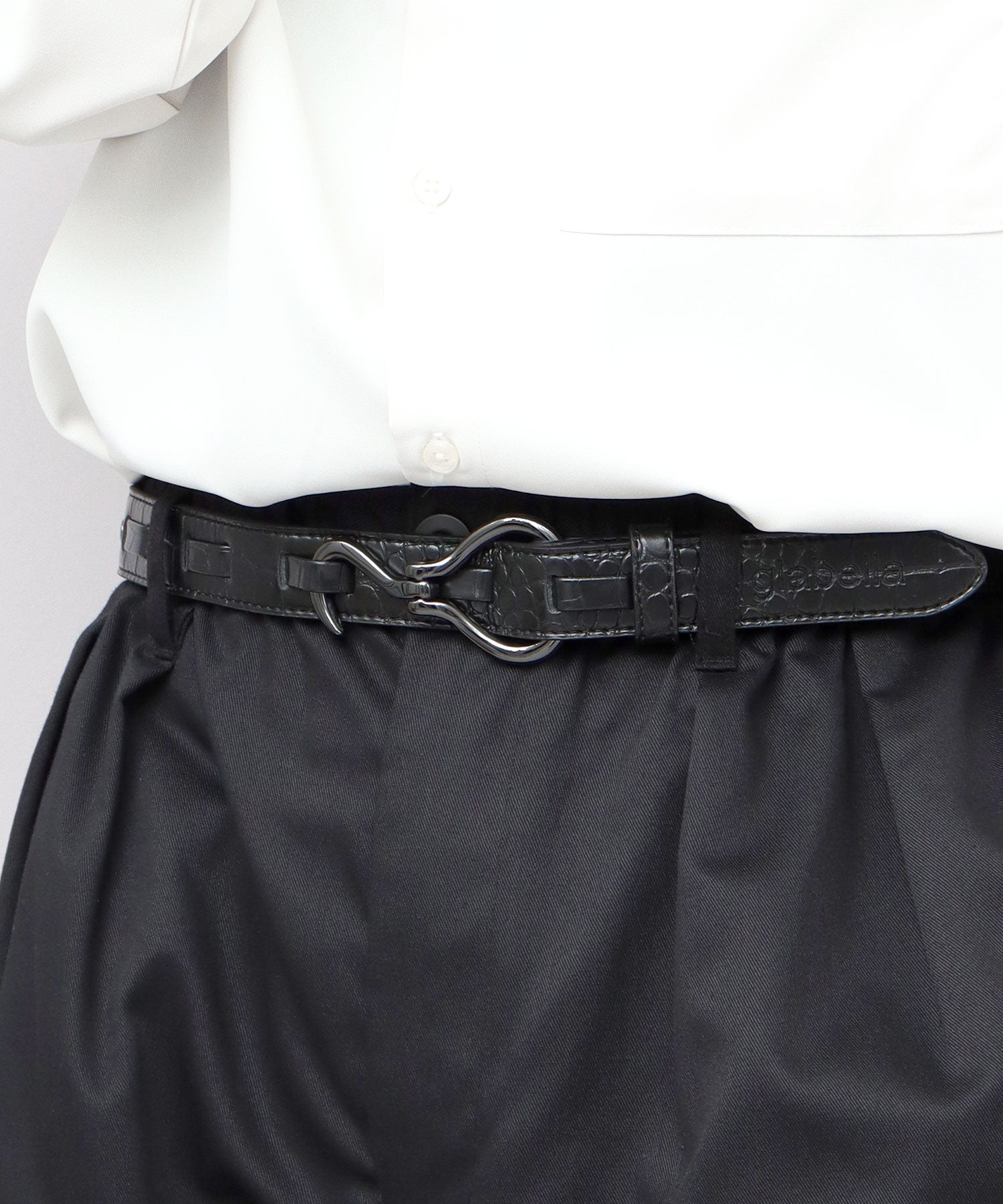 特徴的なフック型バックルを採用した、glabella定番のデザインベルト。